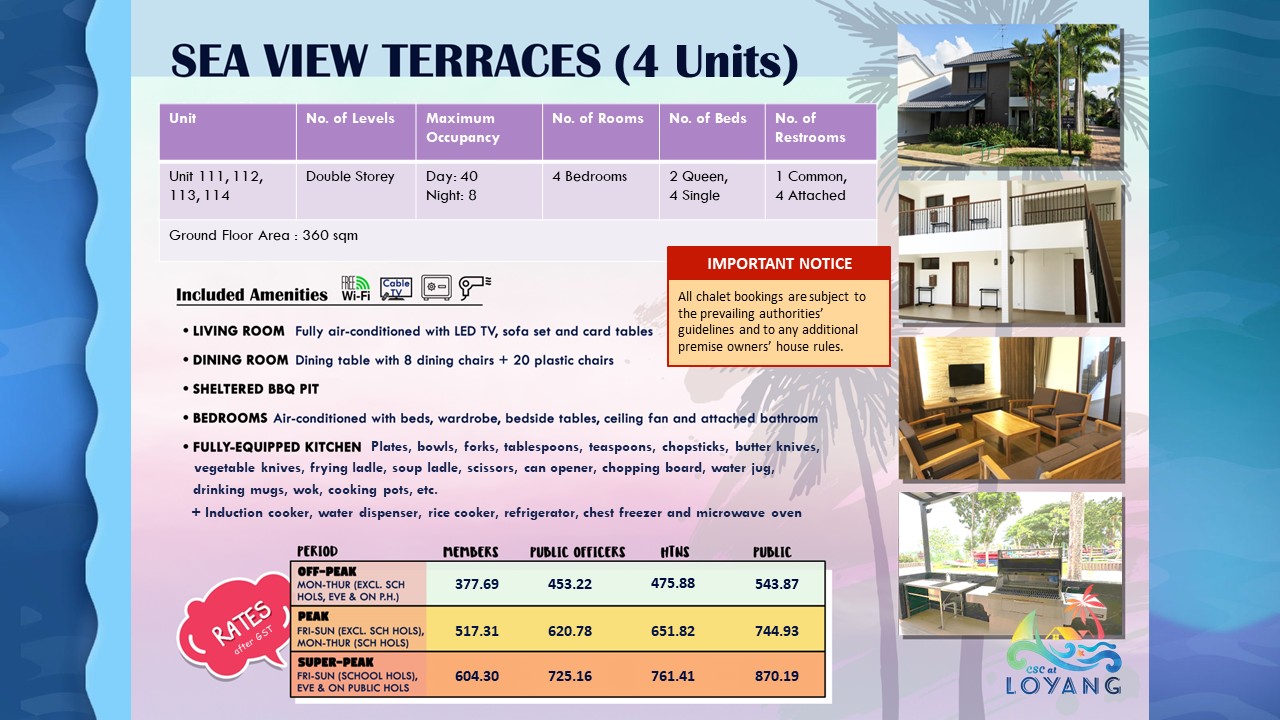 Enjoy the sea breeze right at your doorstep at any of our 4 Sea View Terraces, labelled from Terrace 111 to 114.